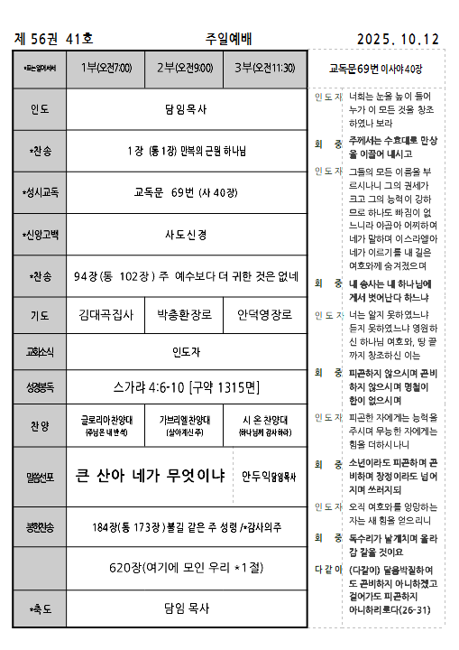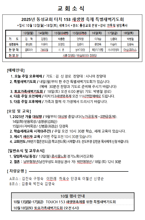 2025년 10월 12일 주보 페이지 정보 작성자 서버관리 댓글 작성일25-10-12 본문 2025년 10월 12일 주보 댓글목록 목록 교회주보 목록 번호 제목 글쓴이 조회 날짜 834 2025년 10월 19일 새생명축제 주보 서버관리 76 2025-10-22 열람중 2025년 10월 12일 주보 서버관리 156 2025-10-12 832 2025년 10월 5일 주보 서버관리 203 2025-10-04 831 2025년 9월 28일 주보 서버관리 144 2025-10-04 830 2025년 9월 21일 주보 서버관리 233 2025-09-24 829 2025년 9월 14일 주보 서버관리 319 2025-09-16 828 2025년 9월 7일 주보 서버관리 698 2025-09-06 827 2025년 8월 31일 주보 서버관리 350 2025-09-03 826 2025년 8월 24일 주보 서버관리 908 2025-08-24 825 2025년 8월 17일 주보 서버관리 1086 2025-08-24 824 2025년 8월 10일 주보 서버관리 832 2025-08-10 823 2025년 8월 3일 주보 서버관리 885 2025-08-10 822 2025년 7월 27일 주보 서버관리 693 2025-08-10 821 2025년 7월 20일 주보 서버관리 941 2025-08-10 820 2025년 7월 13일 주보 서버관리 1035 2025-07-15 819 2025_7_6 주보 서버관리 932 2025-07-05 열린1페이지 2페이지 3페이지 4페이지 5페이지 6페이지 7페이지 8페이지 9페이지 10페이지 다음 맨끝 검색대상 제목 내용 제목+내용 회원아이디 회원아이디(코) 글쓴이 글쓴이(코) 검색어 필수 검색