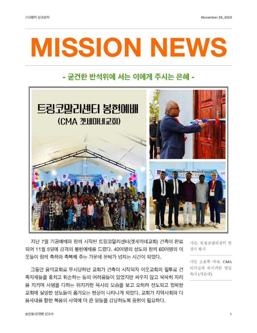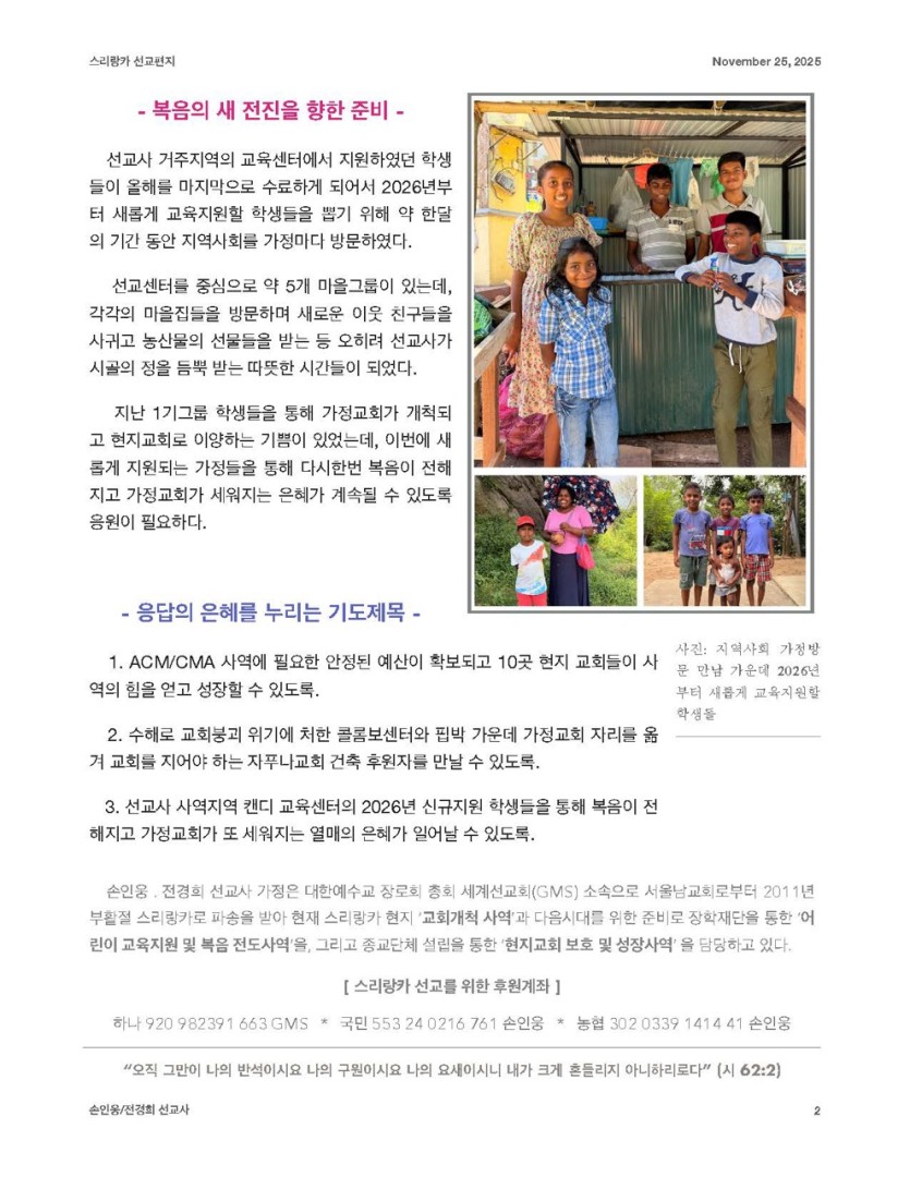 2025년 11월 25일 스리랑카 손인웅선교사의 기도요청과 편지